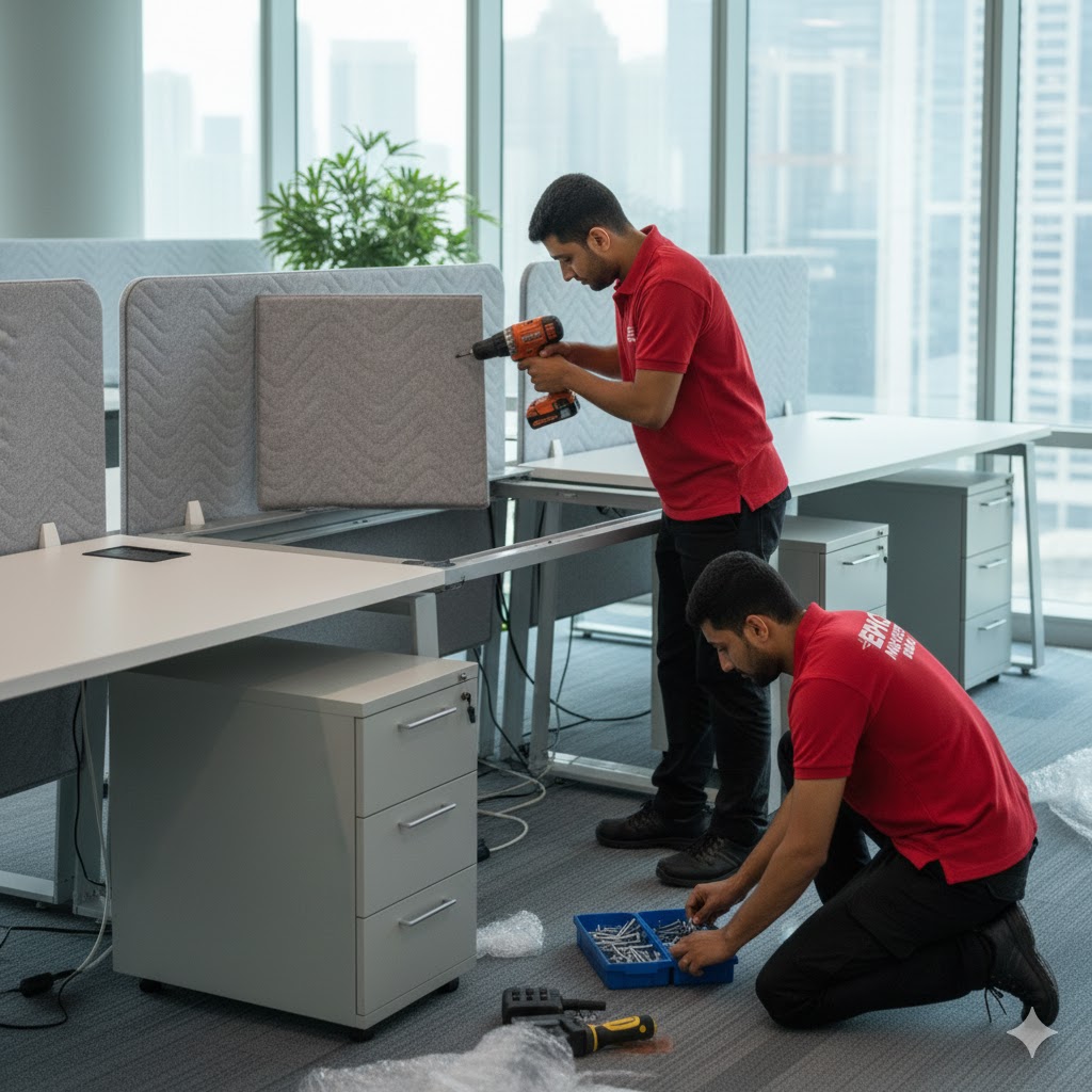 Expert workstation dismantling and assembly services ensuring safe disconnection, organized packing, accurate reassembly, and functional setup of modular office furniture during corporate relocations.